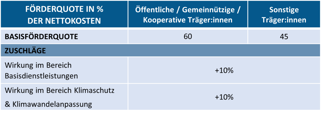 - Öffentliche Projektträger: Kommunen, Kreise, kommunale Zweckverbände, Körperschaften öffentlichen Rechts und Träger deren Eigenmittel im Sinne der EU als öffentliche Mittel angesehen bzw. diesen gleichgestellt werden.