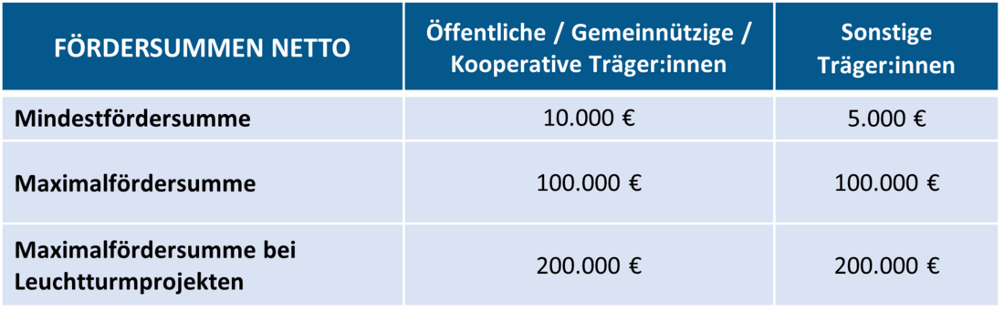 Die Förderquote beträgt 45% der Nettokosten bis zu einer Maximalfördersumme von 100.000,00 EUR und einer Projektgesamtsumme von maximal 500.000,00 EUR. Voraussetzung für eine Antragsstellung ist eine Wirtschaftlichkeitsberechnung für die Dauer der Zweckbindungsfrist, i.d.R. 5 Jahre. Je nach Projektinhalt kann auch eine Konkurrenzanalyse erforderlich werden. Ein Muster für eine Wirtschaftlichkeitsberechnung findet sie bei den Antragsunterlagen für das Grundbudget.